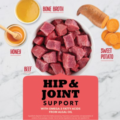 Beef, dehydrated sweet potato, chicken bone broth, honey, pork digest, lecithin, salt, citric acid (preservative), vinegar, marine microalgae oil, mixed tocopherols (preservative), rosemary extract.