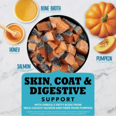 - Helps support skin, coat & digestive health with Omega-3 fatty acids from wild-caught salmon, and fiber from pumpkin.