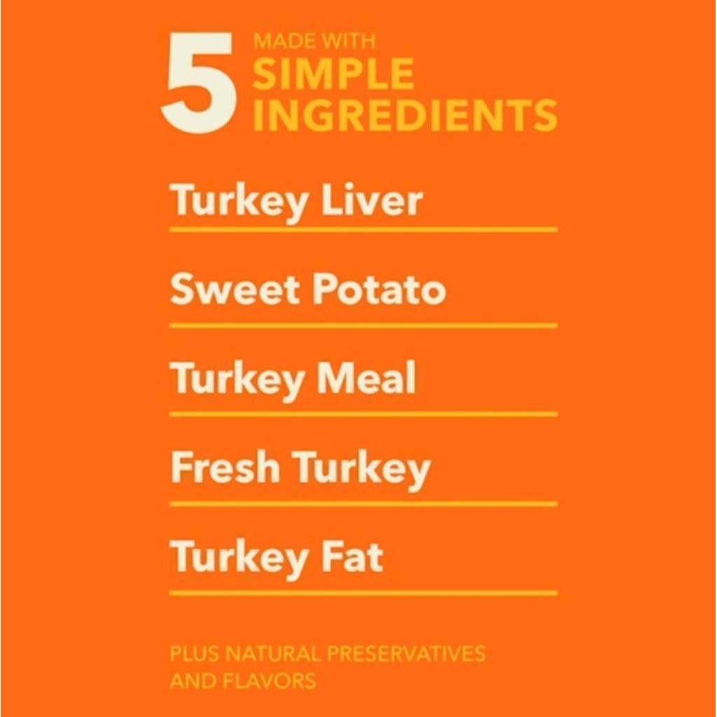 Turkey liver, sweet potato, turkey meal, deboned turkey, natural flavor, turkey fat, mixed tocopherols (preservative), citric acid (preservative), rosemary extract