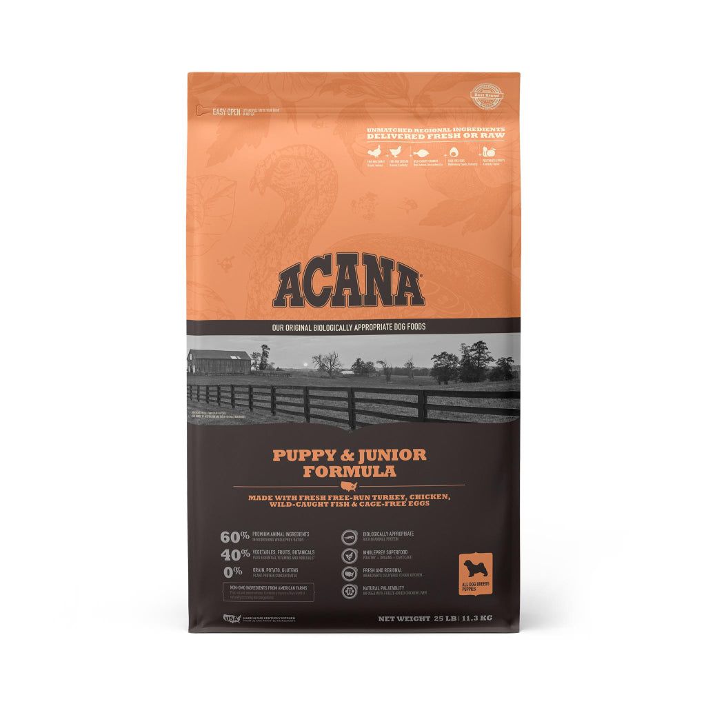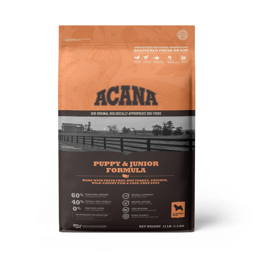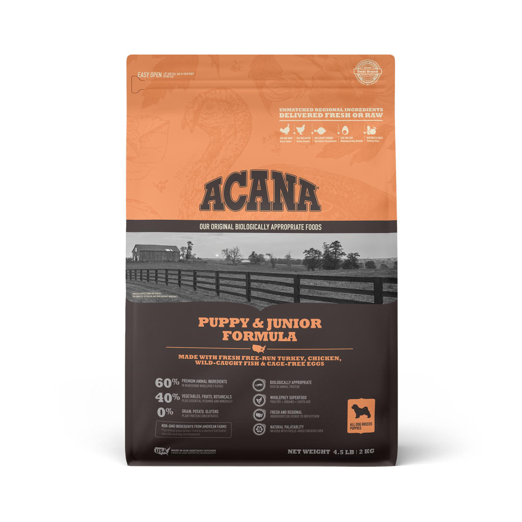 Our ACANA® food for dogs always goes beyond the 1st ingredient, thoughtfully crafting our recipes from start to finish. Your growing puppy needs protein and fat from quality animal protein to support their development. ACANA® Puppy & Junior is balanced with 60%* quality animal ingredients like free-run chicken and turkey, cage-free eggs, and 40%+ fruits, vegetables, and botanicals like whole pumpkin. Artificial colors, flavors or preservatives are never added in our kitchen. Our premium ingredients come from a curated group of farmers, ranchers and fishers we’ve known and trusted for decades, and we approach every batch with an unsurpassed commitment to safety and quality in our award-winning Kentucky kitchen. The result is a protein-rich, nutritious, and delicious dog food to help them live a healthy, happy life. *approximate and derived from the unprocessed state of the ingredients. +we also add vitamins, minerals, natural preservatives and probiotics.