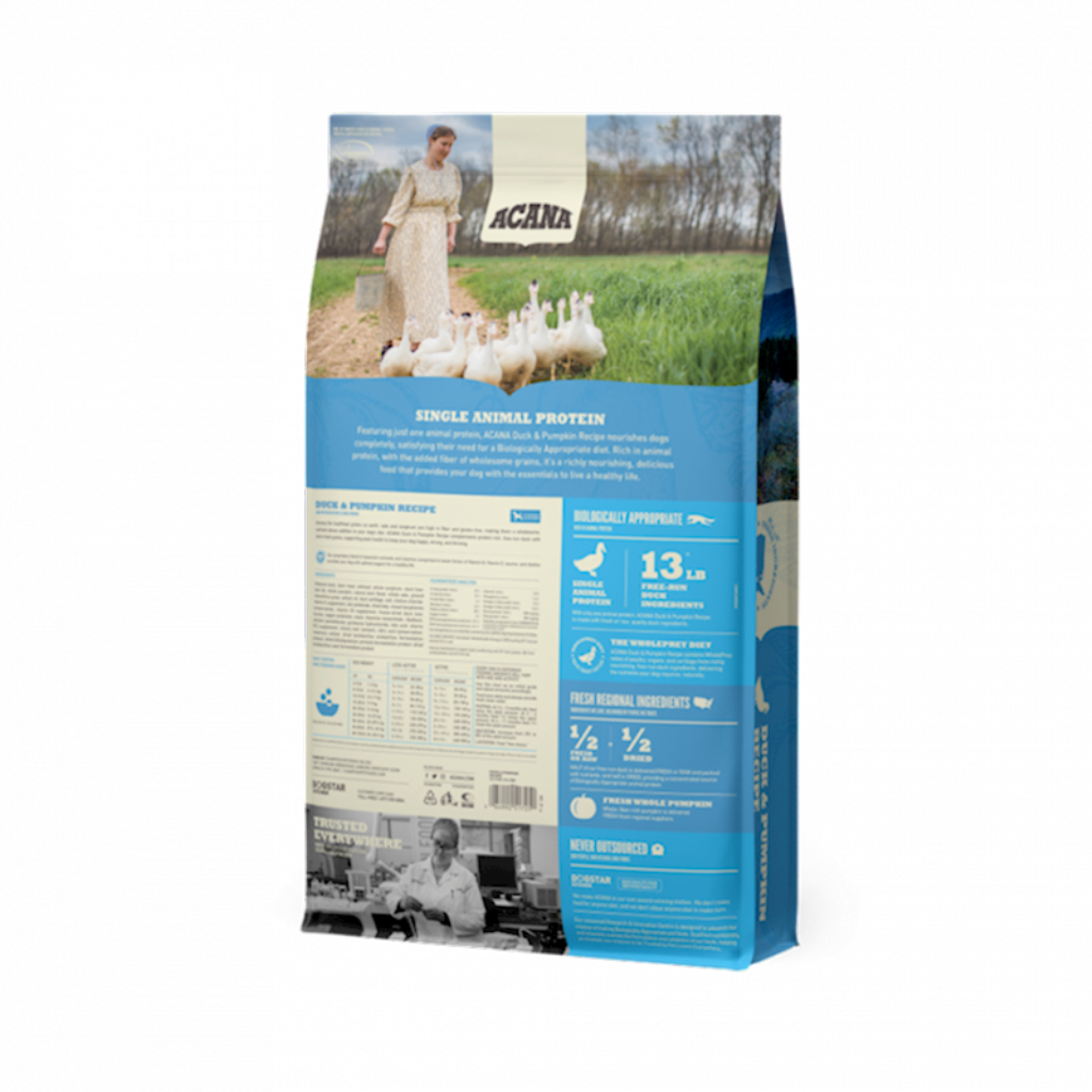 Our ACANA® food for dogs always goes beyond the 1st ingredient, thoughtfully crafted from start to finish. ACANA® Wholesome Grains Limited Ingredient Diet Duck & Pumpkin Recipe is packed with 60%* quality duck ingredients, and complemented with whole, delicious pumpkin and fiber-rich wholesome grains. It provides complete nutrition for choosy dogs or healthy dogs with food-sensitivities. Our premium ingredients come from a curated group of farmers, ranchers and fishers we’ve known and trusted for decades, and we approach every batch with an unsurpassed commitment to safety and quality in our award-winning Kentucky kitchen. The result is a protein-rich, nutritious, and delicious dog food to help them stay happy and healthy. *approximate and derived from the unprocessed state of the ingredients.