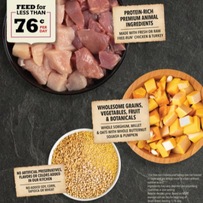 Our ACANA® food for dogs always goes beyond the 1st ingredient, thoughtfully crafted from start to finish. ACANA® Wholesome Grain Small Breed recipe is packed with our delicious free-run chicken*, cage-free eggs, and free-run turkey*, and complemented with wholesome grains like oats, sorghum, and millet. These grains are high in fiber and gluten-free, offering added nutrition that helps support a healthy digestive environment. Our Wholesome Grains Small Breed recipe is specially crafted for your tiny pal, with smaller kibble sizes for small mouths, Omega-3, and Omega-6 fatty acids to promote a shiny coat, and DHA & EPA to support brain health.