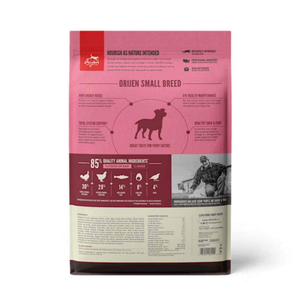 Help your pet thrive with the power of protein-rich recipes that nourish as nature intended. Your small-breed dog has certain nutritional needs and requires a Biologically Appropriate diet in order to thrive. ORIJEN® Small Breed is made specifically for smaller dogs, with nourishing protein and nutrients packed into a unique kibble shape that is easier for them to eat. With rich inclusions of Wholeprey animals, ORIJEN is made with the most nutrient-dense, succulent parts of the prey to deliver the nutrition dogs need. The result is a diet for your small canine companion that is beyond comparison. *approximate and derived from the unprocessed state of the ingredients. **Our fresh ingredients use refrigeration as the sole method of preservation. Our raw ingredients are the same as our fresh, but are frozen at the peak of freshness to preserve nutrients.