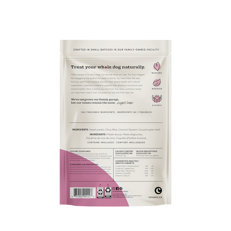 Our original, best selling dental sticks are a great way to make oral care fun for your dog! A delicious natural sweet potato flavour combined with finely-ground oyster shells to aid in the removal of plaque and tartar build-up on canine teeth.