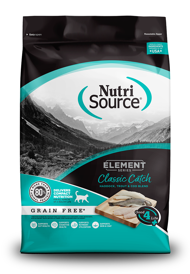 NutriSource® Element Series Classic Catch Recipe Grain Free Cat Food is formulated to meet the nutritional levels established by the Association of American Feed Control Officials (AAFCO) Cat Food Nutrient Profiles for all life stages.