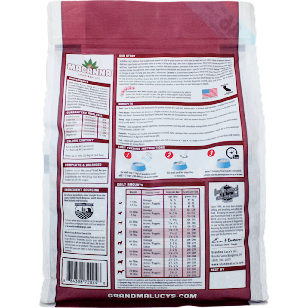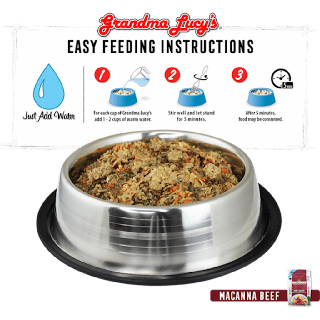 Give your precious pup the gift of healthy food that tastes great with Grandma Lucy's Macanna Beef Recipe freeze dried Grain Free Dog Food. This wholesome recipe is packed with superfoods like hemp hearts, coconut, kale and turmeric so your dog can happily chow down and enjoy optimal nutritional benefits. Every single ingredient is chosen with a specific benefit in mind, inspected for quality and prepared in small batches at their family-owned California facility. Ideally suited for pets with food allergies or sensitivities, it’s the easy way for your dog to eat his way to better health. Plus, it doesn't contain any meat meals or by products.