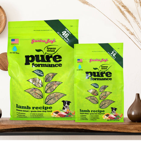 Pureformance is packed with a punch containing only the best ingredients to give them that liveliness they need for all that walking, hiking, and fun. This food is a whole new approach to freeze-dried pet food. Our delicious selection of unique proteins are accompanied by highly nutritious chickpeas, fruits, and vegetables. Chickpeas are full of flavor and a rich source of dietary fiber and protein allowing energy to be released slowly for a consistent energy level. Grandma Lucy's Pureformance uses simple ingredients to bring your pet the best simple nutrition in one convenient bag that will get your pet jumping for joy (literally)!