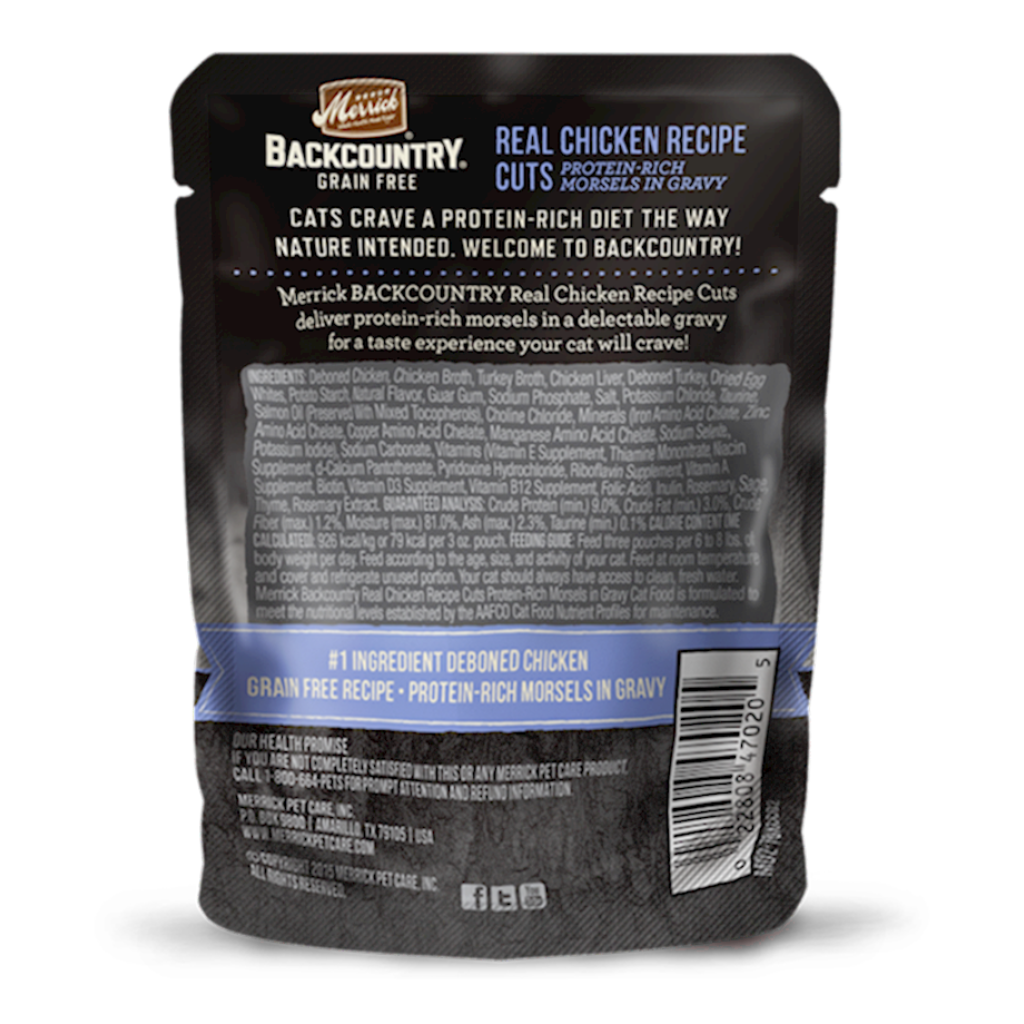 Merrick Backcountry Recipe Cuts provide a meaty flavor for felines to feast upon plus the balanced nutrition and necessary moisture cats need. This wet recipe features protein-rich morsels in gravy, served in a convenient, single-serving pouch.