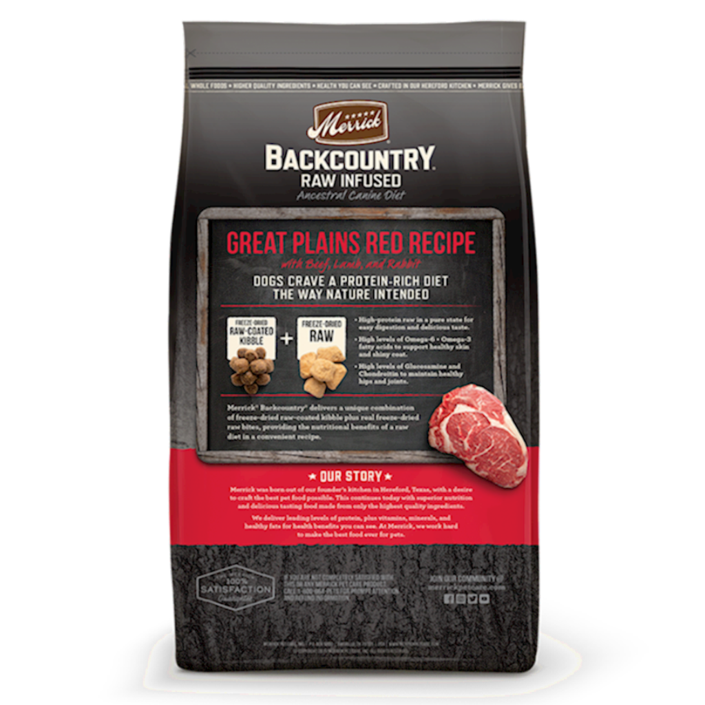 Merrick Grain Free Backcountry Raw Infused Great Plains Red Recipe Dry Dog Food is an ancestral canine diet packed with protein dogs crave. This natural, grain free formula provides your dog with the nutritional benefits of a raw diet they would have discovered in the wild in a safe and convenient recipe that's easy to serve.