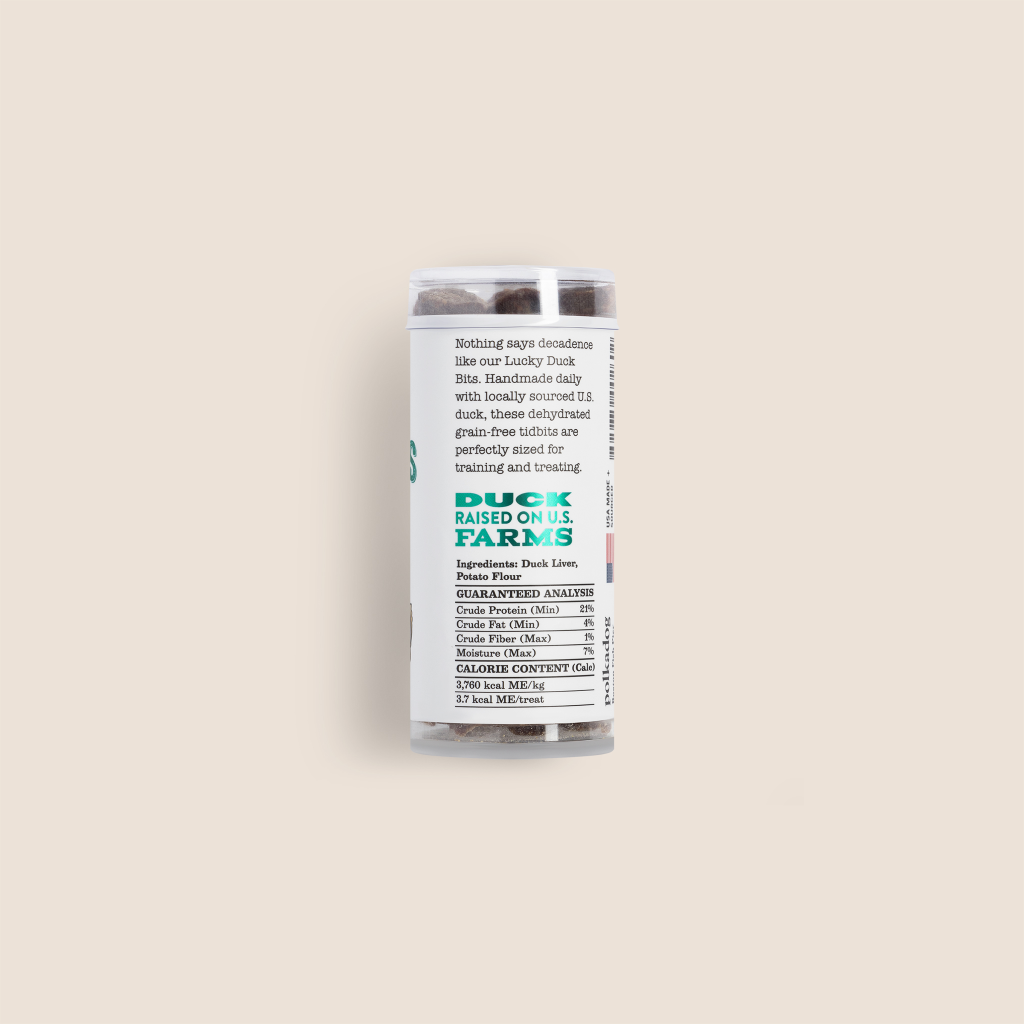 Nothing says decadence like our Lucky Duck Bits. Handmade daily with locally sourced U.S. duck, these dehydrated grain-free tidbits are perfectly sized for training and treating.