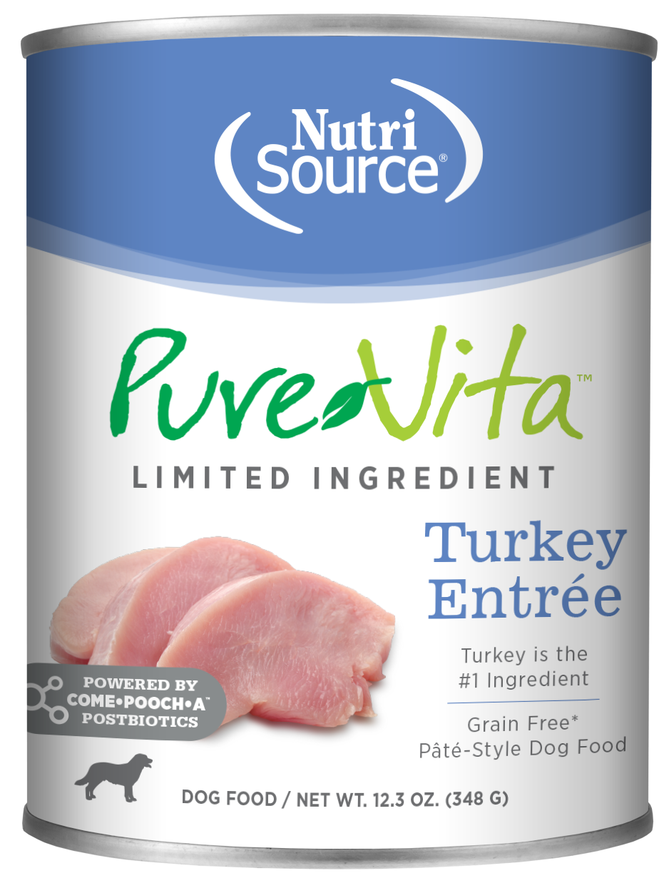 - NutriSource PureVita Pate-Style dog food features meat rich, single source animal protein dense recipes.