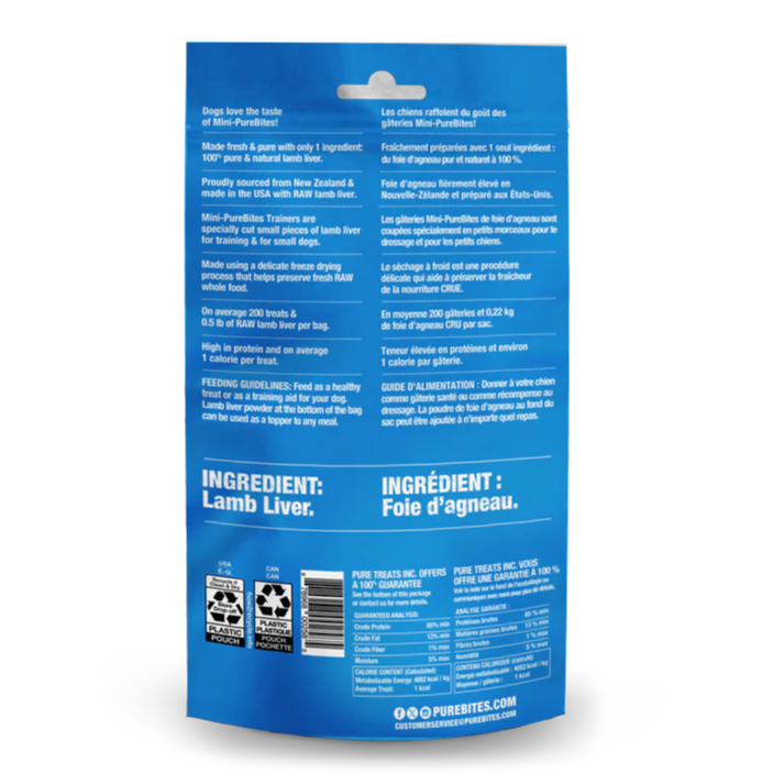 Go ahead, look at our single ingredient: freeze dried lamb liver. That’s it! Smaller pieces for puppies and small dogs; the perfect training treats.