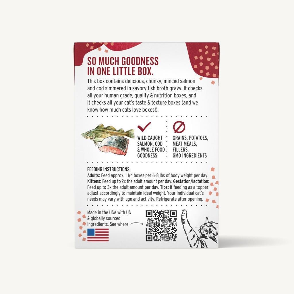 This box contains delicious, chunky, minced wild caught salmon and cod simmered in savory gravy. This gourmet fish in gravy recipe is made with 100% human grade ingredients and is free of fillers. Meaning it checks all your quality & nutrition boxes, and all your cat’s taste & texture boxes (and we know how much cats love boxes!)