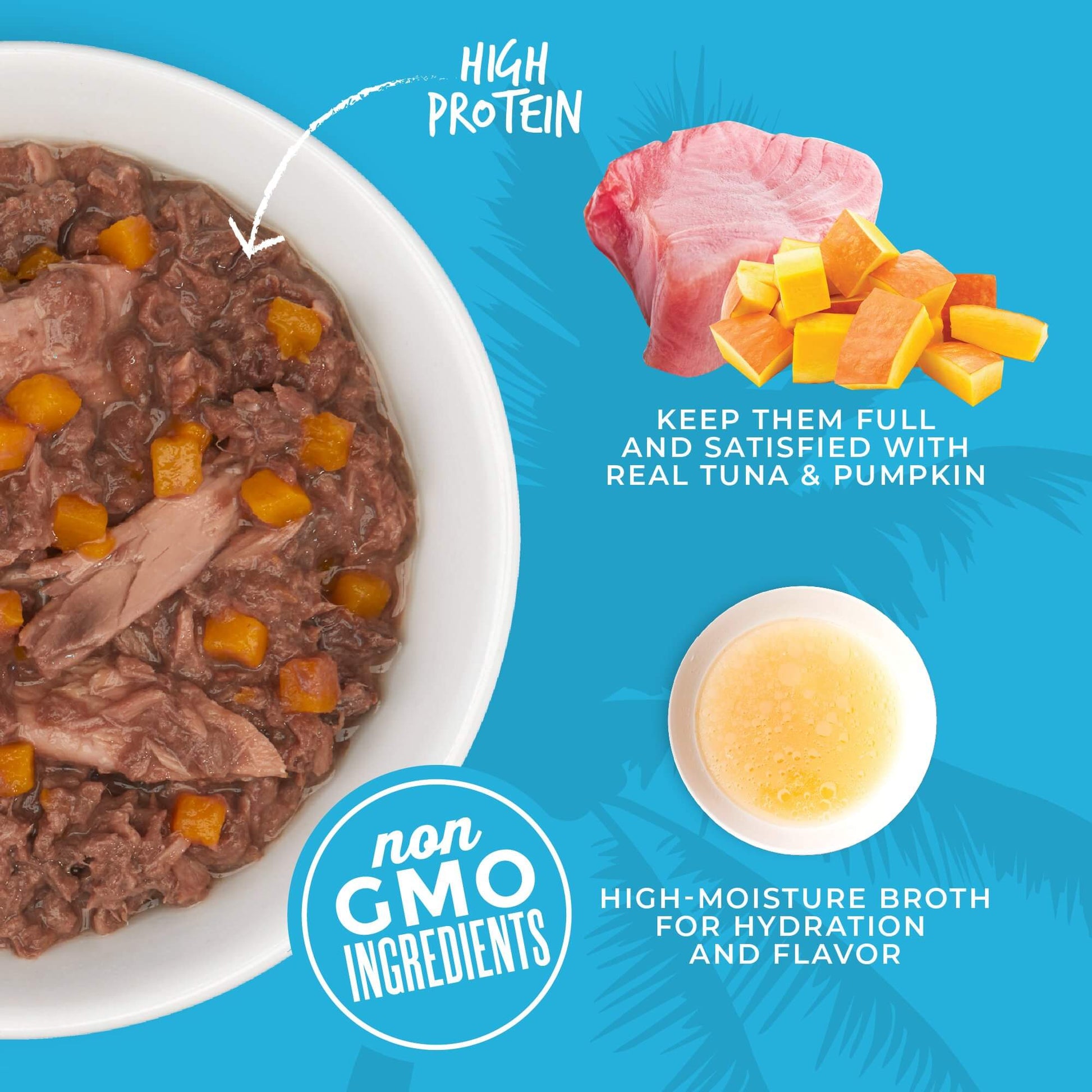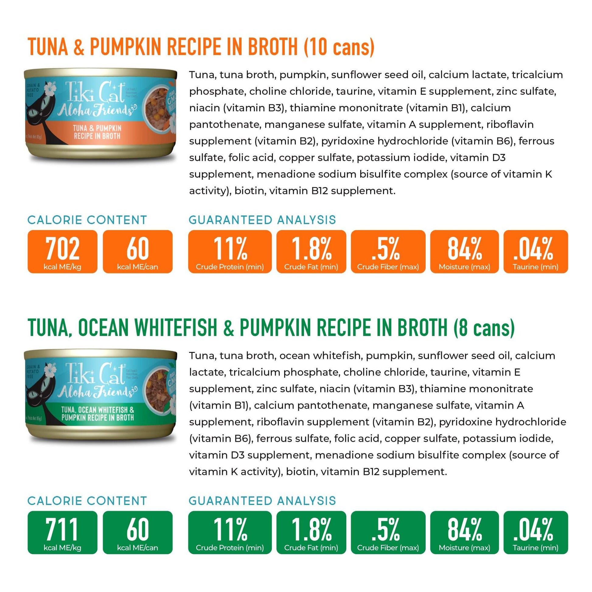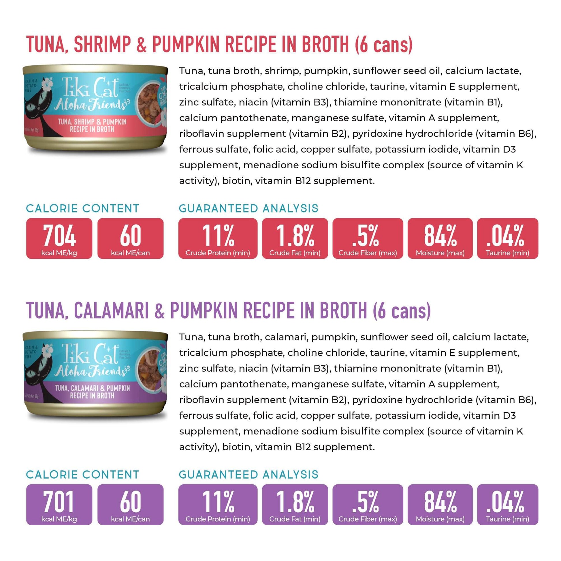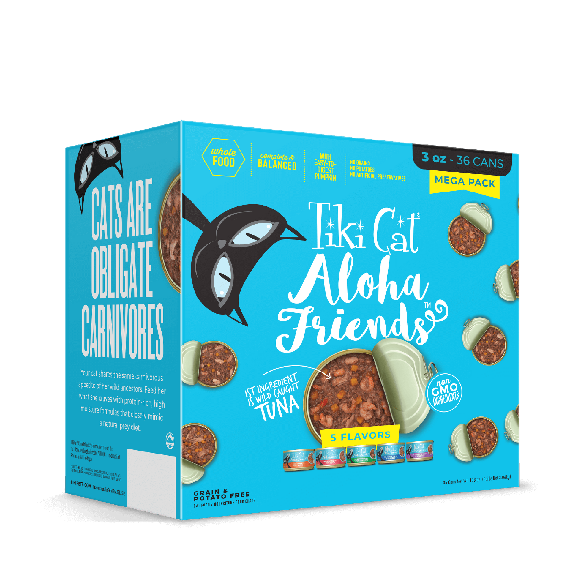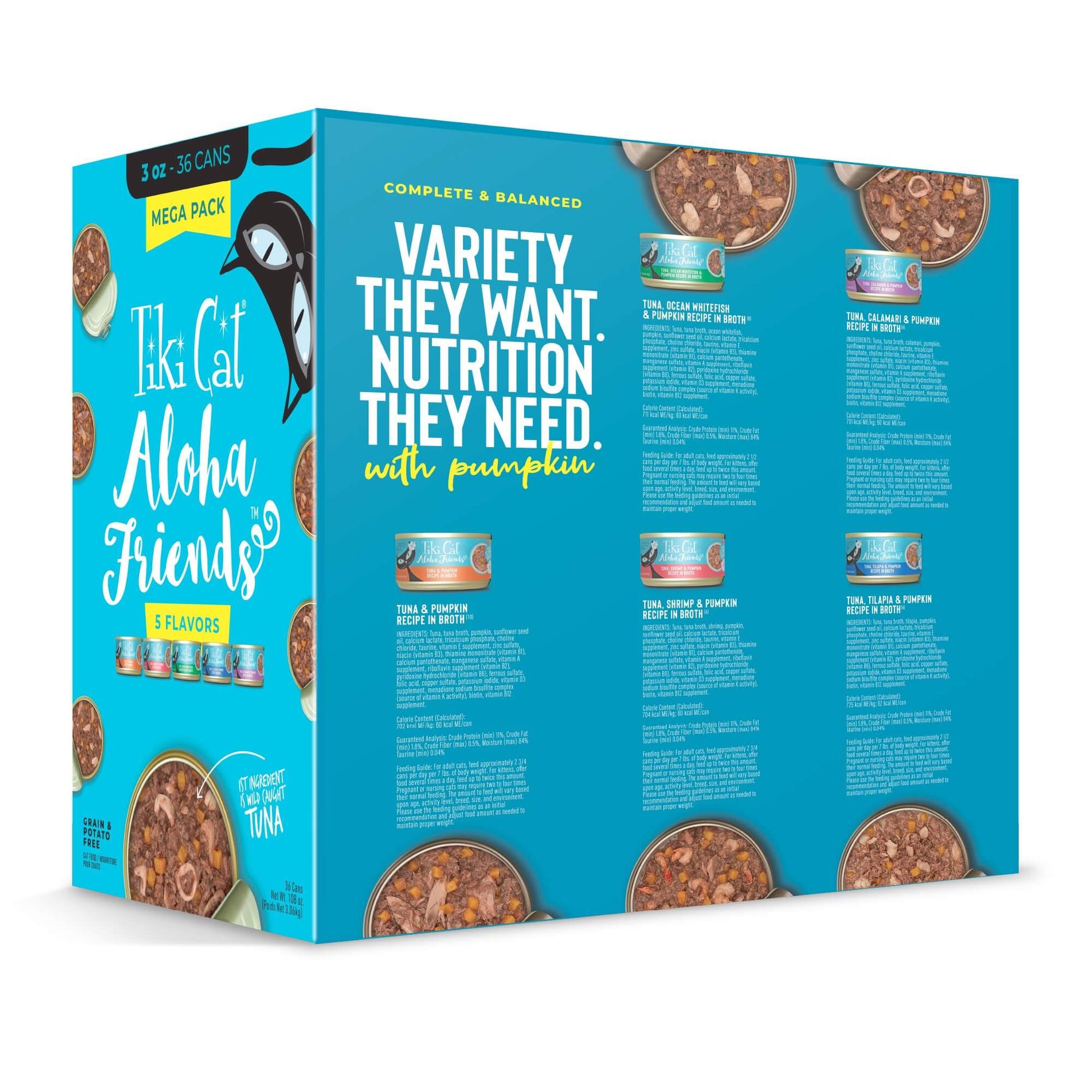 Tiki Cat® Aloha Friends™ Tuna Mega Pack provides five delicious tuna recipes to satisfy any cat’s tuna cravings in this convenient 36 pack box. Each recipe includes easy-to-digest pumpkin for a gentle fiber source.