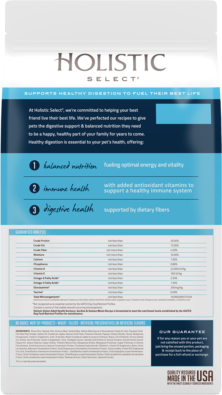 This Holistic Select Adult Health Anchovy, Sardine & Salmon Meals Recipe is formulated with a unique Digestive Health Support System, including active probiotics, healthy fiber and digestive enzymes. When combined with the other high quality, natural ingredients, this recipe supports the absorption and utilization of vital nutrients throughout your dog’s entire body. Your dog will look and feel healthy from the inside out.