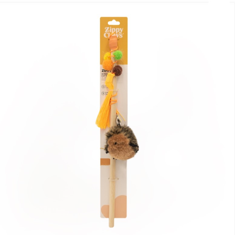 The ZippyClaws ZippyStick Hedgehog is a cat teaser wand with a removable plush, catnip-filled hedgehog cat toy attached to the end of the string. The string also features pom poms and a tassel and is secured to an eco-friendly, durable bamboo wand.